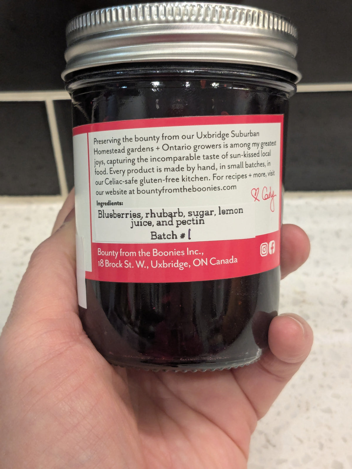 INGREDIENTS: blueberries, rhubarb, lemon juice, pectin, sugar