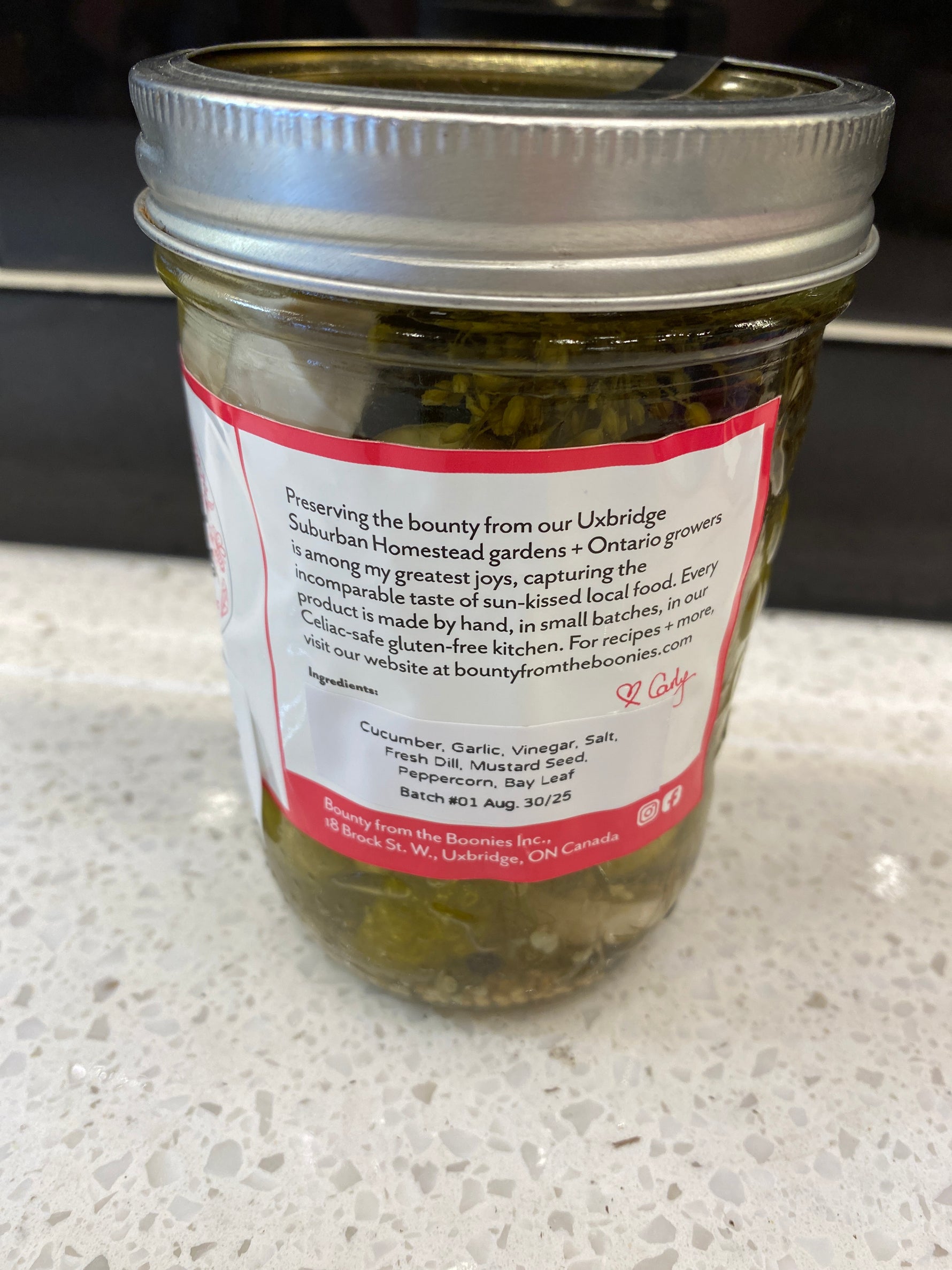 They were made with fresh dill and cucumbers from our gardens and the garlic came from the Uxbridge farmers market.