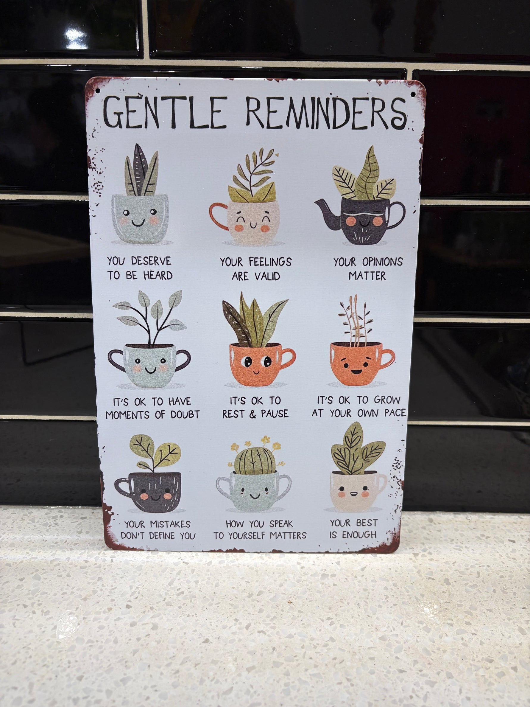 Kind words that celebrate our mental health wellness with the cutest cups o'plants. 11.5" x 8" metal sign with four pre-drilled hanging holes