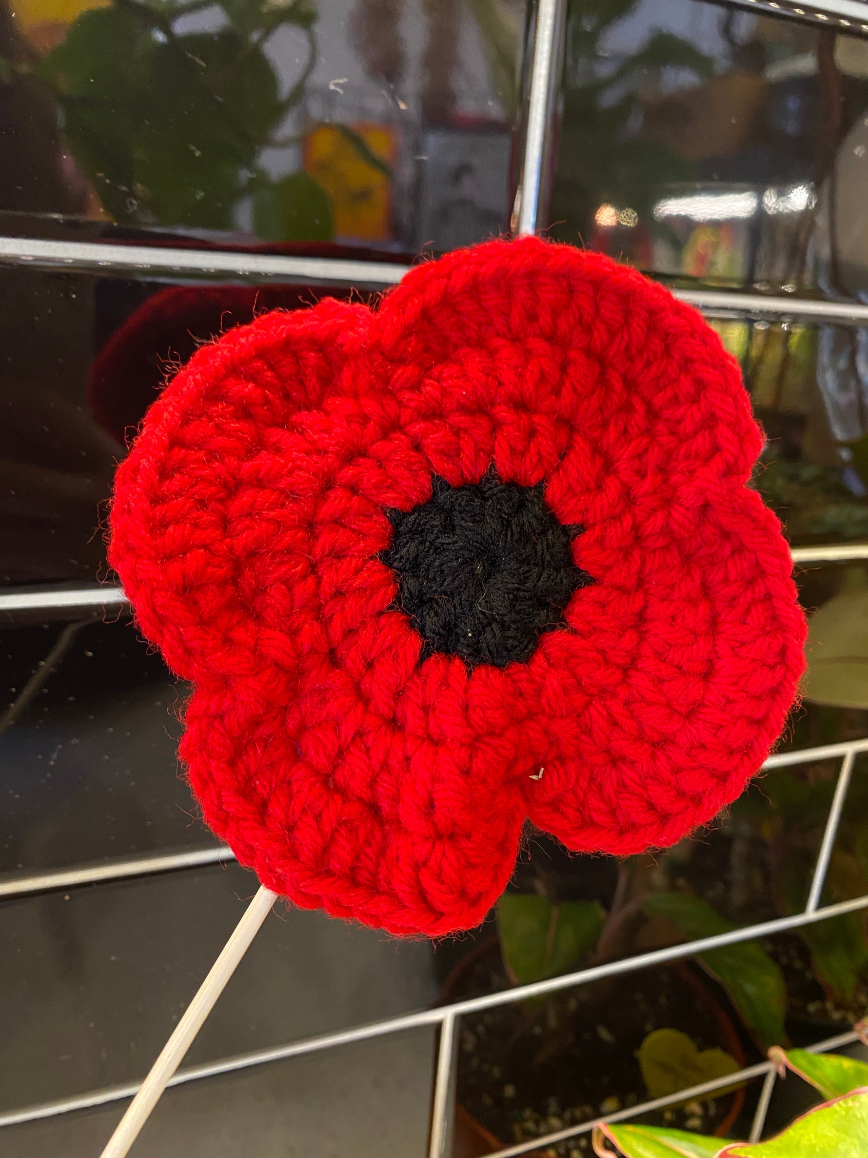 Beautifully hand crocheted poppies are the perfect tribute to our military personel for Remembrance Day. A pack of 5 is only $10 and all proceeds go to the Uxbridge Legion Poppy Fund.