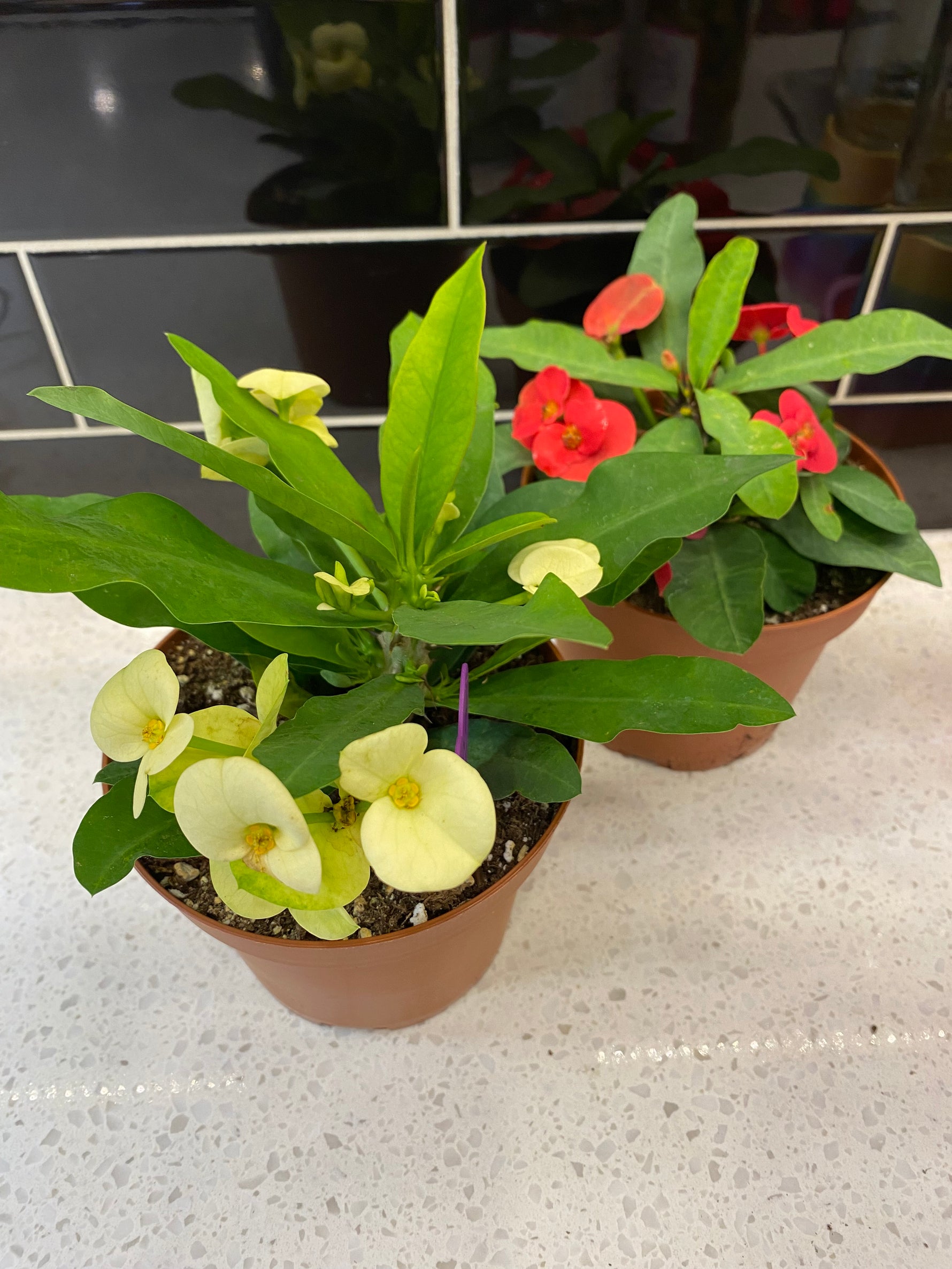 The Crown of Thorns plant is a succulent native to Madagascar known for its spiny stems and colourful, long-lasting bracts that look like flowers. It's often associated with good luck and protection.  These flowers will bloom all year round!